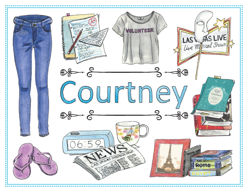 Courtney’s closest friends are her sisters—with all the time she spends on school and work, she doesn’t have time for anyone else. She’s never had a boyfriend and is fine with waiting to date until college. (She doesn’t need any distractions right now!) She’s not into the high school party scene, and whenever she has time in her busy schedule, her favorite thing to do is read novels. She also loves listening to Broadway music (Phantom of the Opera and Wicked are her favorites) and would love to see a live show someday.