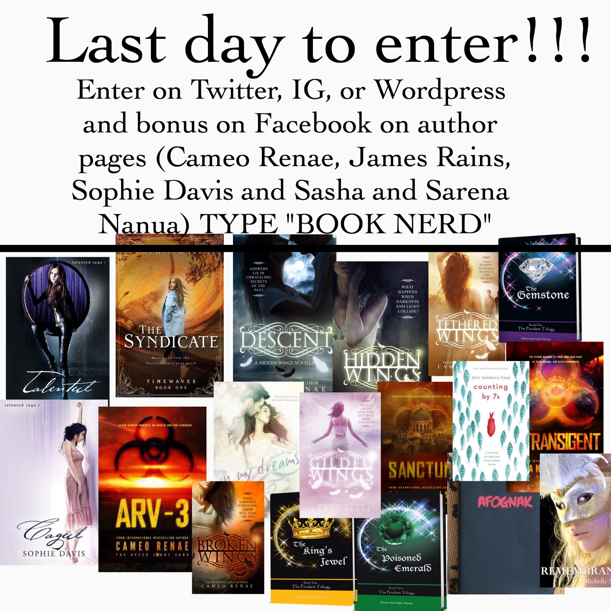 Enter once on Twitter, IG, and WordPress and bonus on Facebook on author pages one last time (Cameo Renae, James Rains, Sophie Davis and Sasha and Sarena Nanua) TYPE “BOOK NERD” @officialsophiedavis @jamesrainsauthor @cameo_renae @sarenasashabooks @michellemadow #giveaway #yabooks #talented #caged #hiddenwings #thependanttrilogy