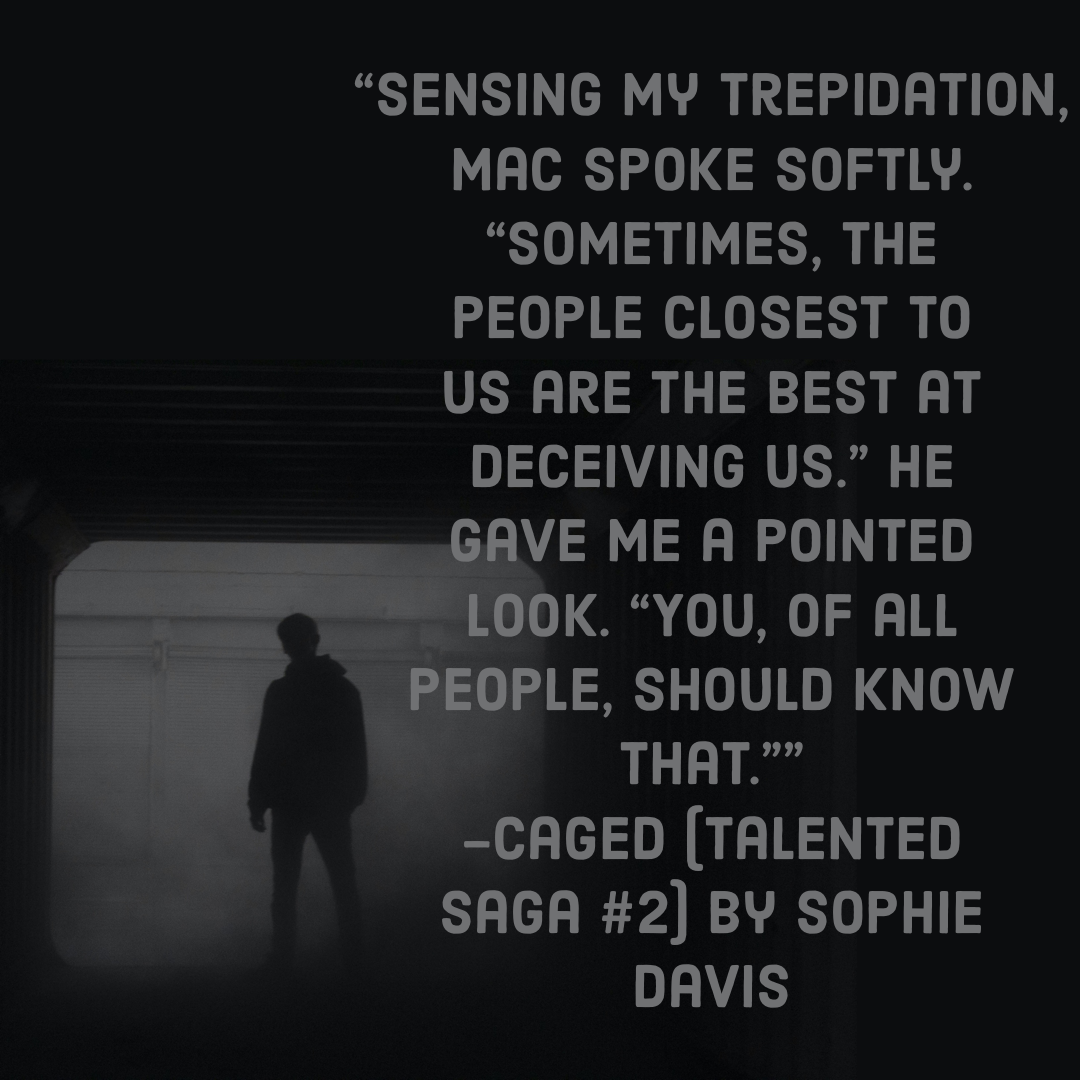 Caged follows the events from Talented…so if you haven’t read Talented, READ IT!! Even though this is my second time reading Caged, I loved it even more! In this book, Talia attempts to recover from the aftermath of being captured by Ian Crane in Nevada (and eventually escaping). In her recovery, Mac gives Talia a chance to work undercover to find out how her cover was blown while on her solo-mission in the previous book. Mac believes that there is a spy that has been secretly feeding Ian Crane and the Coalition information about TOXIC.