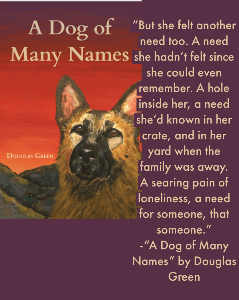 I loved how unique the author made the chapter titles. Since the book is called “A Dog of Many Names,” the dog is given a different name in each chapter based on who she is with and what she experiences. I liked the fact that the author dedicated this book to his own rescue shepherd who had been with two previous owners who simply didn’t want her. Green, the author, said that it took a bit of time for her to learn to trust him due to her past experiences. He said since she obviously couldn’t verbalize what she was feeling/what she went through, he had to do his part to observe her, to accept and understand her quarks.